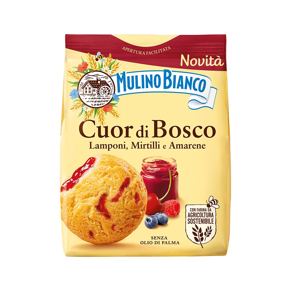 Mulino Bianco Cuor di Bosco are soft, Italian shortbread biscuits filled with a mix of raspberry, blueberry, and black cherry jam. Palm oil-free and are made with flour from sustainable agriculture. These cookies are ideal for breakfast or as a snack and are free from artificial preservatives, colorings, and GMOs.