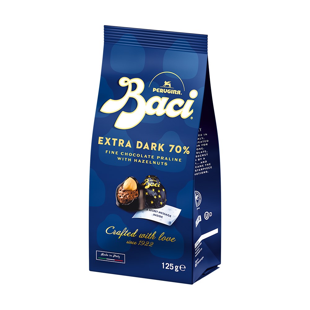 Baci Perugina Extra Dark 70% is a refined combination dedicated to dark chocolate lovers. The soft inner made of hazelnut and caramelized chopped cocoa nibs, the ever-present whole hazelnut, carefully selected and toasted and covered by an intense 70% extra dark chocolate gives a moment of pure and persistent pleasure. The wrapper is black illuminated by precious golden stars and inside, the inevitable, the love note, hides a sweet message.